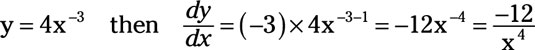 Be careful with this last derivative. When a variable with an exponent appears in the denominator, such as x3 in the previous equation, the variable can be moved to the numerator, but the exponent becomes negative. So, 4/x3 becomes 4x-3. Then when you take the derivative, make sure you subtract 1 from –3 to get –4.