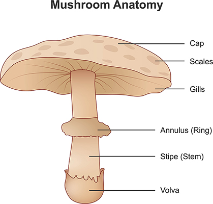 Mushrooms appear in a wide variety of shapes, colors, and textures. Many mushrooms have both a cap and a stipe (stem). Careful observation of the physical characteristics of these parts can help you with mushroom identification: