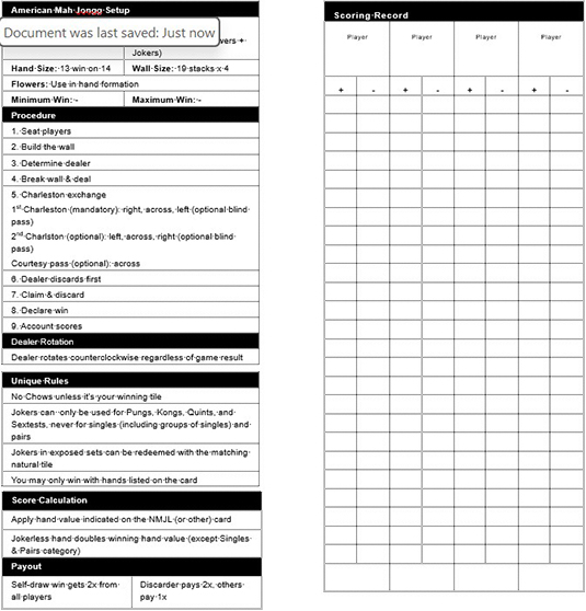 American Mah Jongg uses the NMJL card (or other similar cards), but the play and scoring work the same. This cheat sheet highlights the key rules and shortcuts so you can focus on playing, not flipping pages.