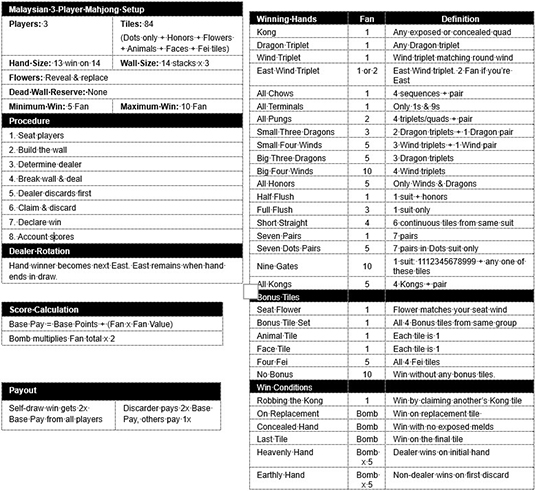 This cheat sheet gives you all the essentials of Malaysian 3-Player Mahjong at a glance — from setup and winning hands to scoring and payouts. Keep it by your side to stay on track and focus on the fun.